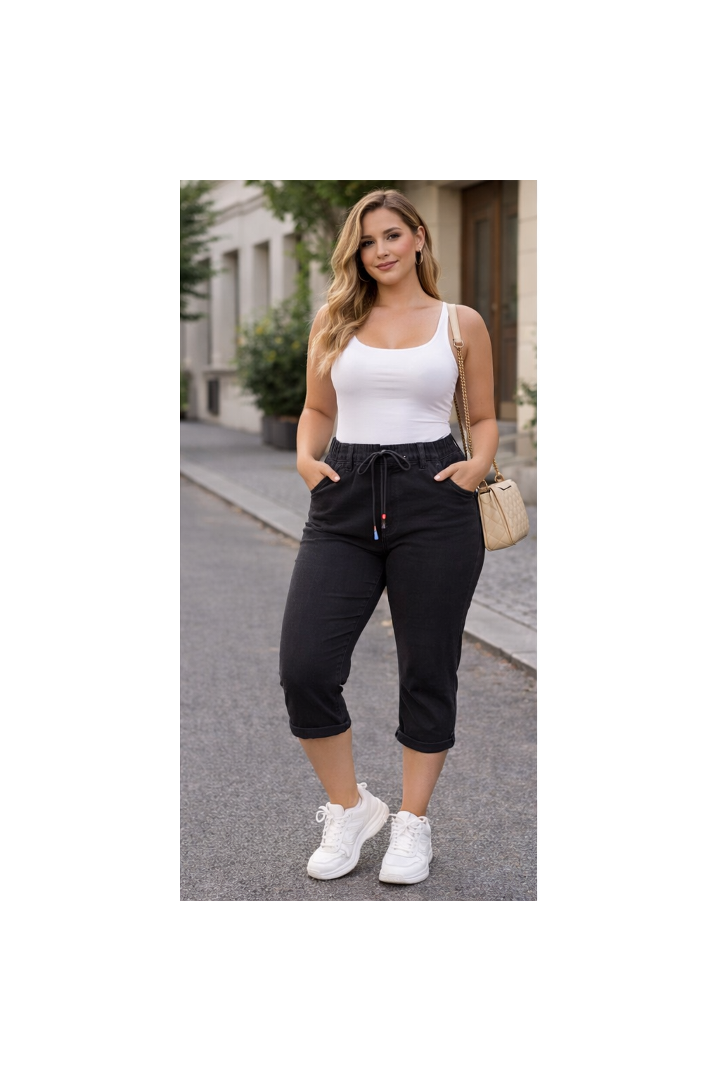Kalhoty mají pružný pas s gumou, takže se snadno oblékají a netlačí. Push-up střih na zadní části opticky tvaruje postavu a dodává efekt štíhlejší siluety. 3/4 délka je ideální do teplejších dnů a skvěle se kombinuje s teniskami i sandály.