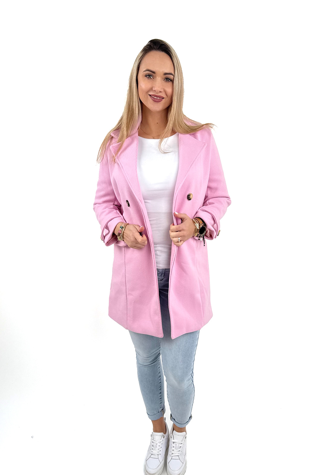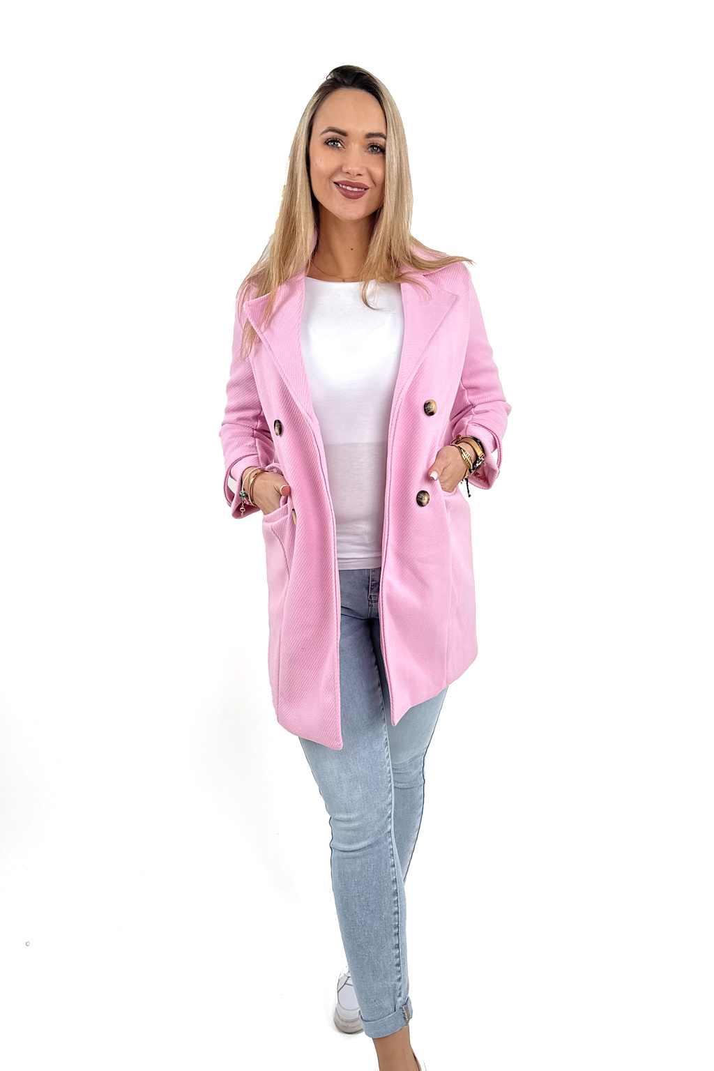 Dvouřadý dámský kabát Pink je elegantní, nadčasový a přitom moderní kousek, který unosíte do práce, do města i na schůzku. Díky dvouřadému zapínání působí luxusně a krásně tvaruje siluetu.